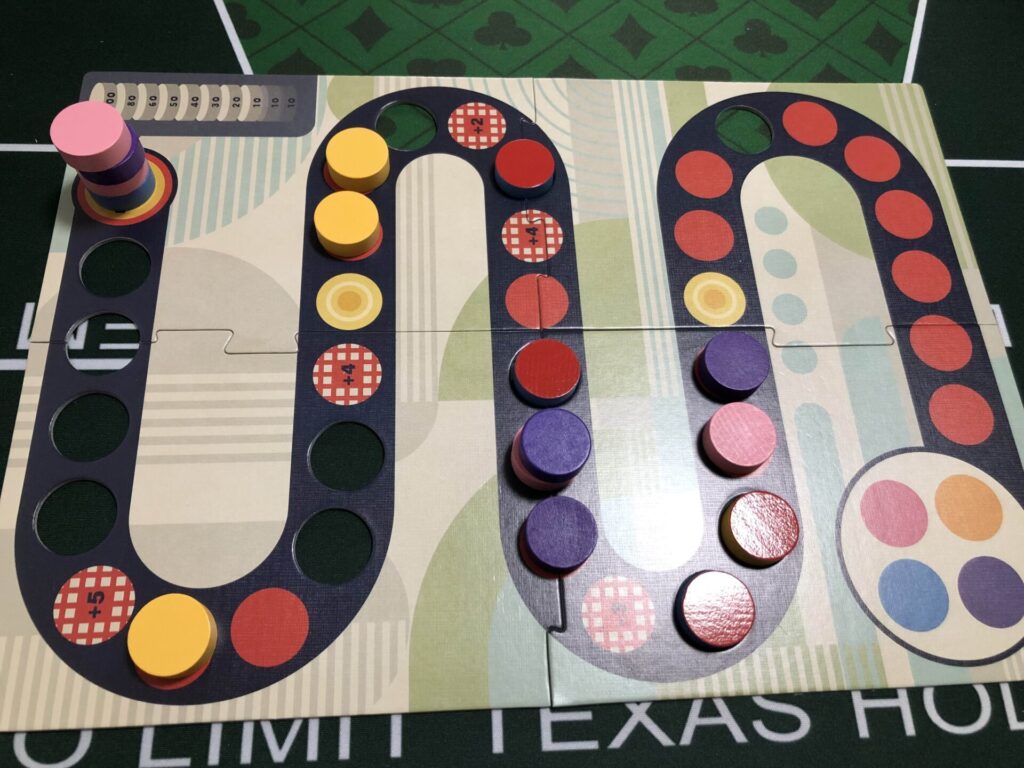 各プレイヤーは4つのコマを持ち、それらを「遅く」ゴールさせるほど多くの得点を獲得するすごろくゲームです。