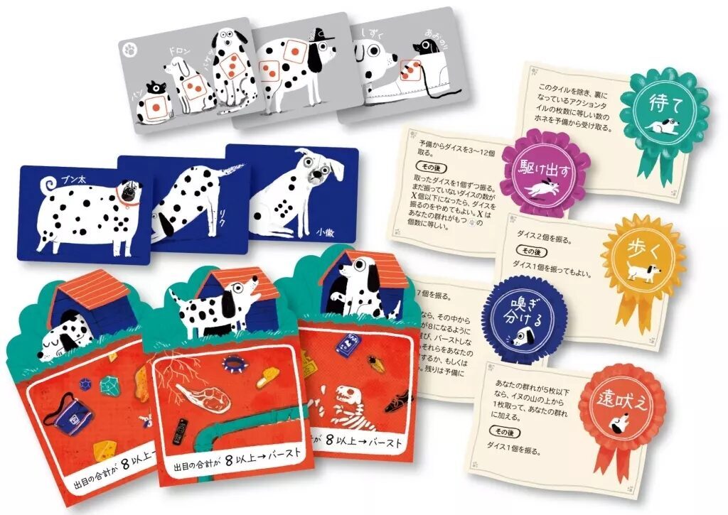 サイコロで犬の模様を完成させる、運と戦略が融合したボードゲーム。