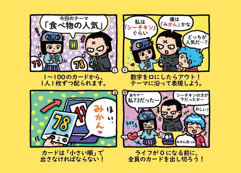 配られた数字を伏せたまま、テーマに対する何かを発表し、小さい順に並べて全員で正解すれば勝利。