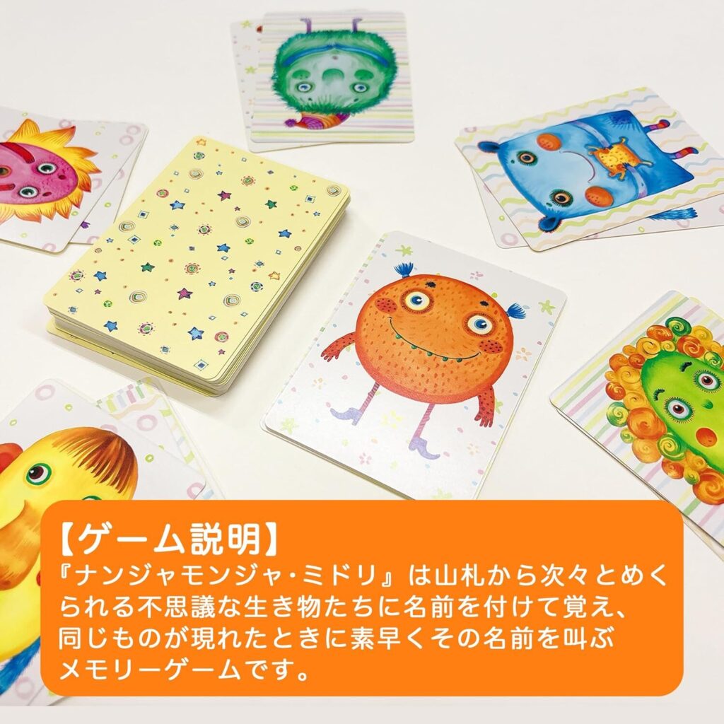 ヘンテコな生き物に名前を付け、同じカードがでたら付けた名前を叫ぶ記憶力が求められるボードゲーム。