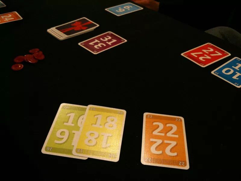 カードを1枚オープンし、引き取るかパスするかを選択。パスするにはチップを支払う必要があります。引き取ったカードは、その数字がそのままマイナス点。ただし、数字が1つ違いなら重ねてOK。さらに引き取った場合は、それまでに支払われたチップも獲得できます。