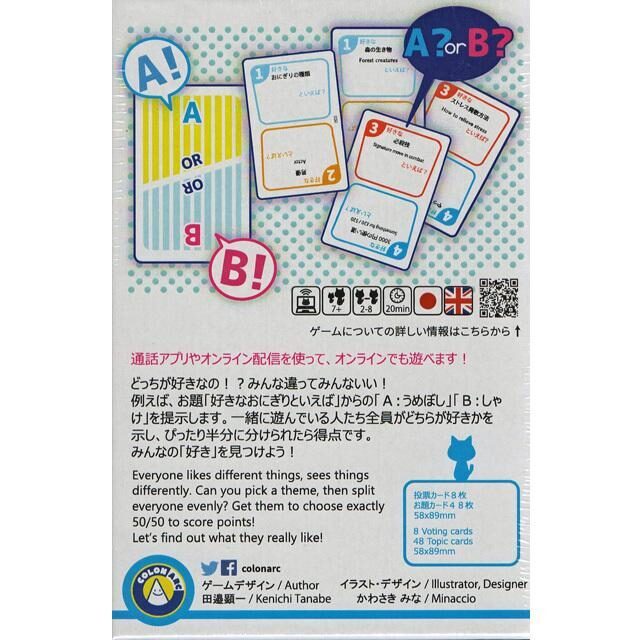 AとBどっちが好きかのお題を考える、どっちが好きかを答える。シンプルですぐに遊ぶことができます。