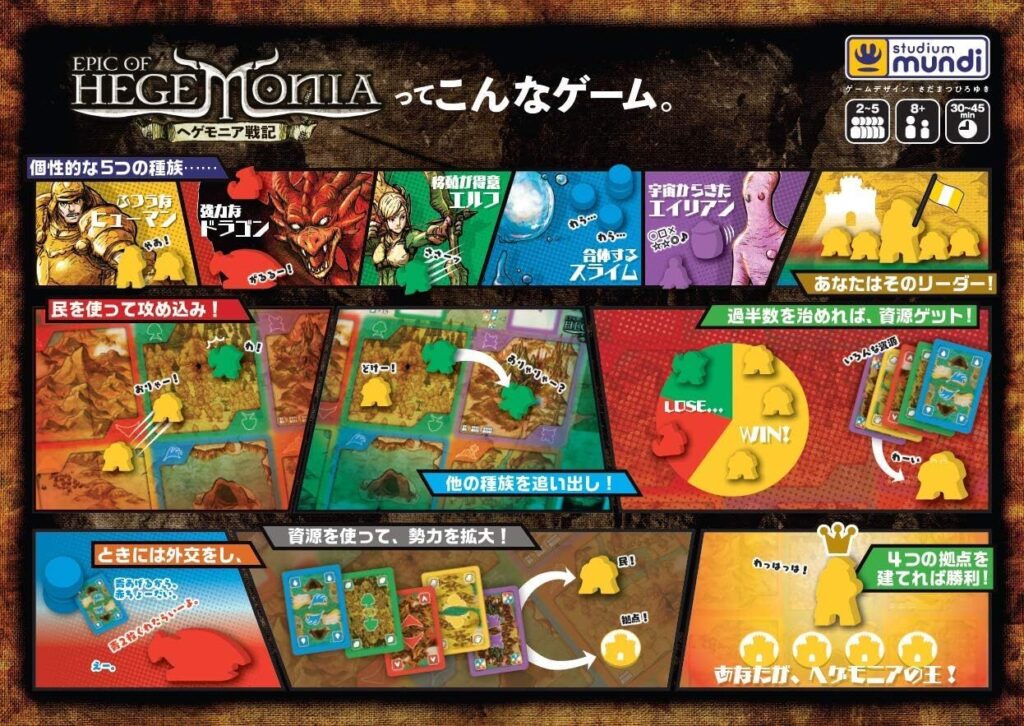 5つの種族それぞれに特徴がある『ヘゲモニア戦記』種族の違いを楽しみながらの陣取り合戦が、このボードゲームの魅力。
