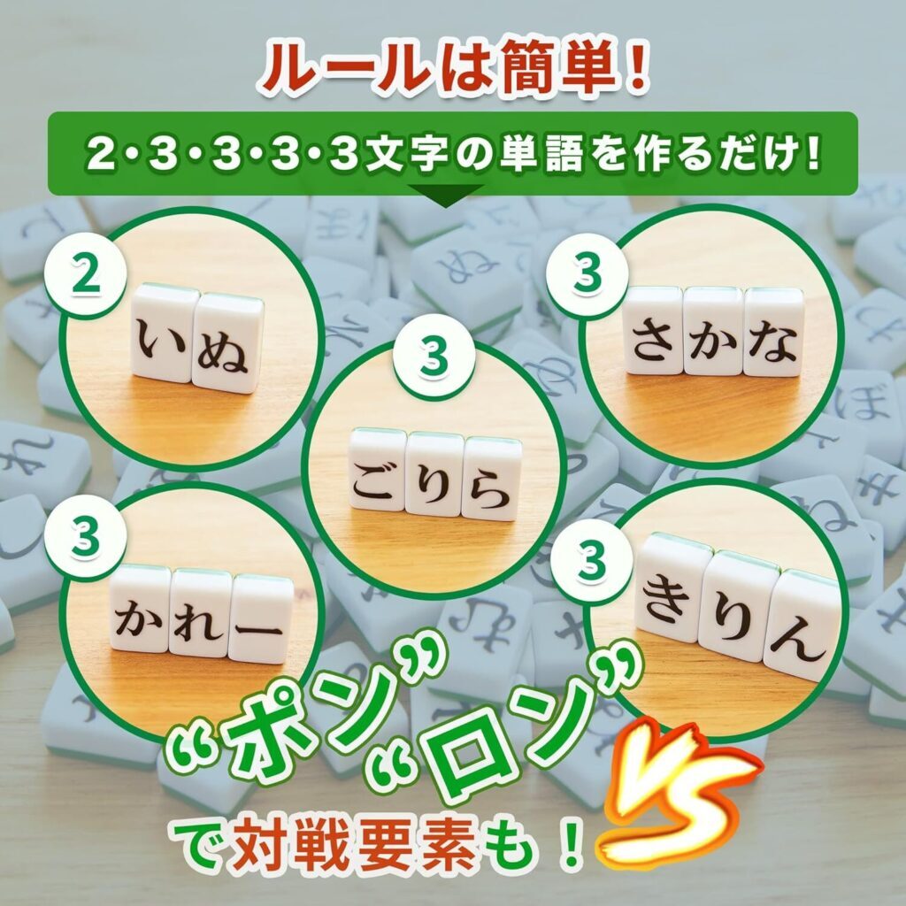 麻雀の要領でひらがなの牌を引いて「言葉を揃える」新感覚ゲーム!役を覚えなくていいからルールは超シンプル。子どもから大人まで一緒に楽しめて、遊びながら自然と語彙力もアップする一石二鳥な作品です。