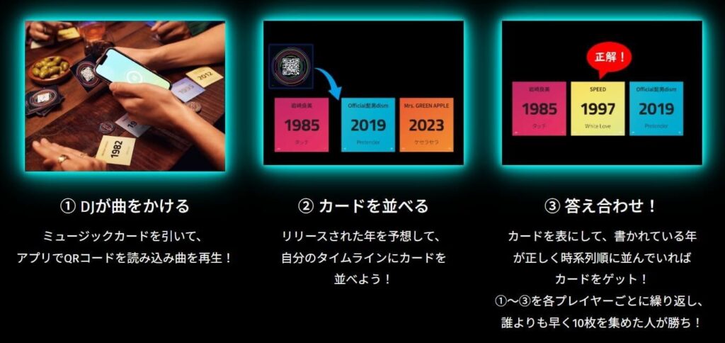 スマホで流れるヒット曲を聴いて、リリース年順にカードを並べるだけ!昭和の懐メロから2024年の曲まで幅広く収録されているので、世代を超えた思い出トークが自然と弾む、今最も話題の音楽パーティーゲームです。