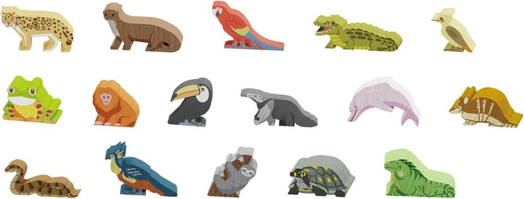 『ライフ・オブ・ジ・アマゾニア』は、まず箱を開けた瞬間、テンションが上がります。16種類、色とりどりの動物コマがとにかくかわいいです。