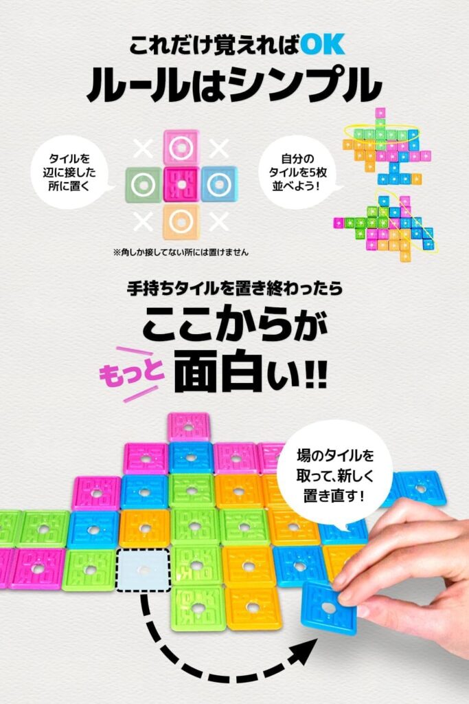 手持ちのタイルをタテ、ヨコ、ナナメいずれかで5つ並べたら勝ち。