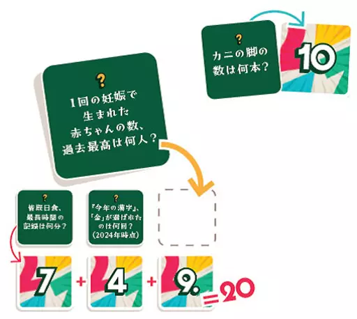 ブラックジャックにクイズ要素を組み合わせた超絶盛り上がるパーティゲーム!答えが0〜10になるトリビアクイズを使って合計21を目指すチーム対戦で、知ってるようで知らない難問に一喜一憂必至。200枚のクイズカードで繰り返し遊べ、最大12人まで対応なのも嬉しい!