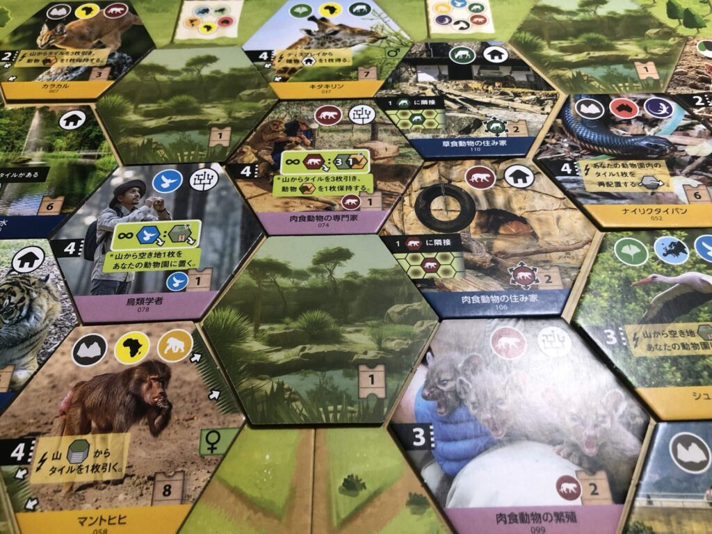 タイルごとにさまざまなアイコンが印刷されていて、それぞれ意味が違います。「山岳」「水生」「草食」「肉食」…などのタグアイコンに加えて、得点系・効果系のアイコンまで覚えると、最初のうちは混乱して覚えるのが大変ってなります。