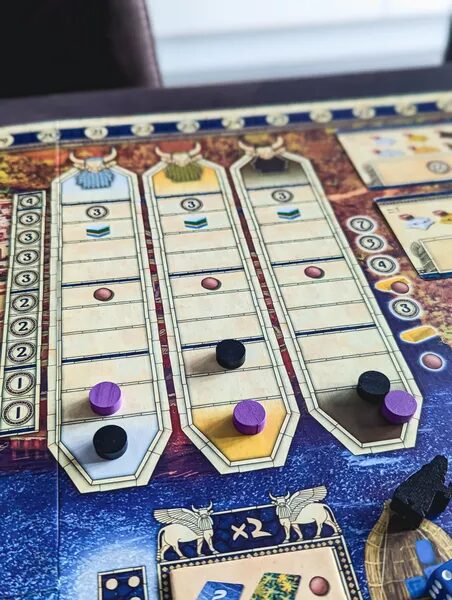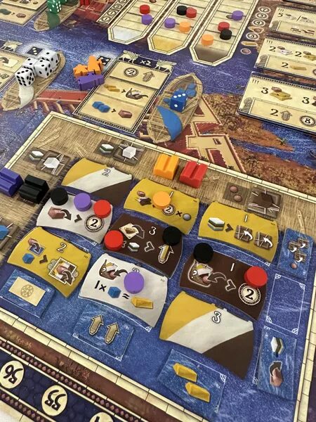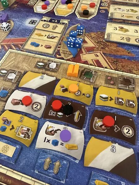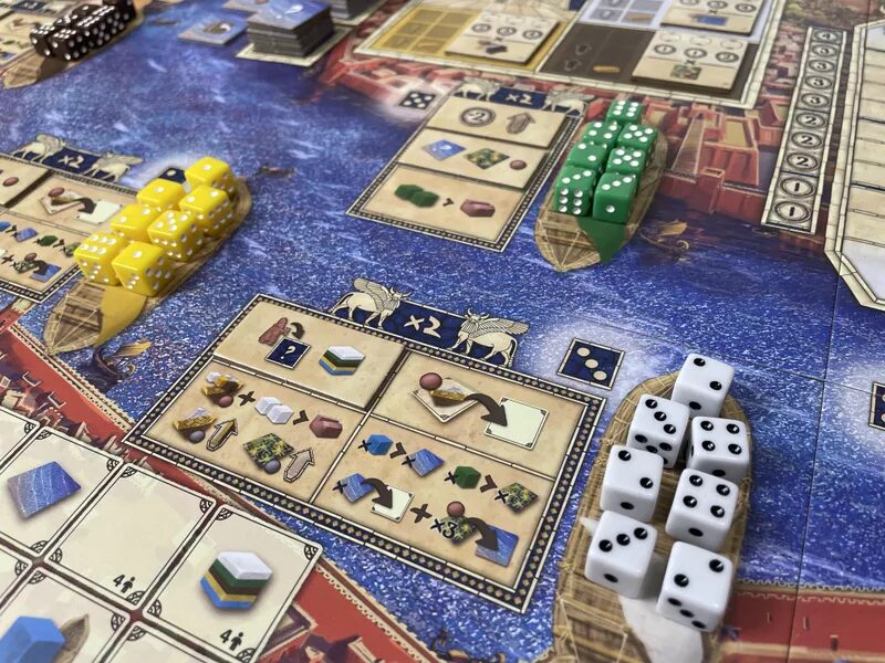 ダイスで行き先が決まり、選んだダイスがそのまま資源にもなる他にない仕組みが『タバヌシ:ウルの建築士たち』の面白さであり楽しさです。